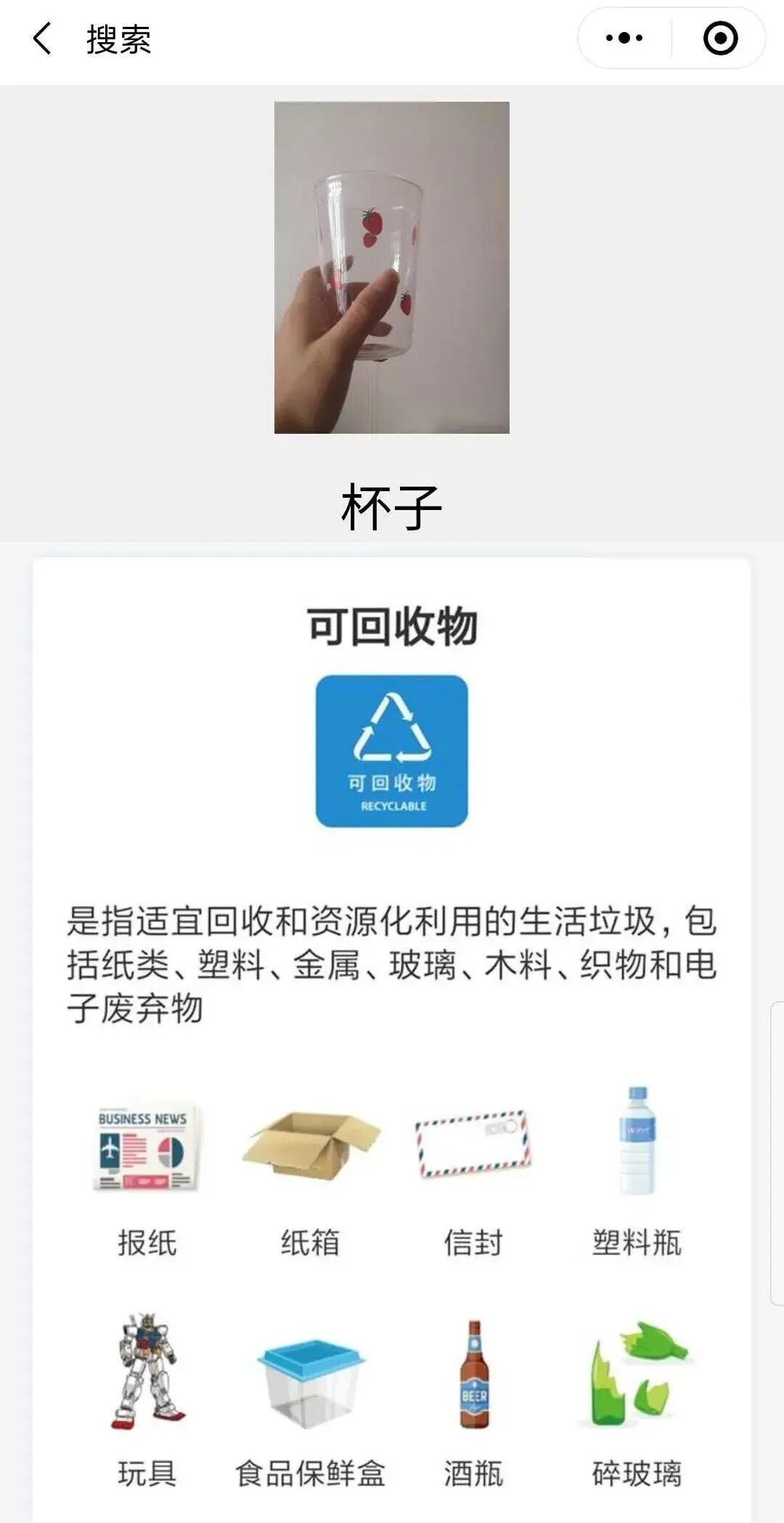 页面的主要位置设置了文字、拍照和语音识别三个检索区。想要知道某种垃圾该如何投放,可任意选择多种不同的检索方式。随手拿起一个杯子,拍照后点击检索按钮,小程序立刻检索出这是“杯子”,同时告知这属于“可回收物”。