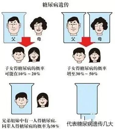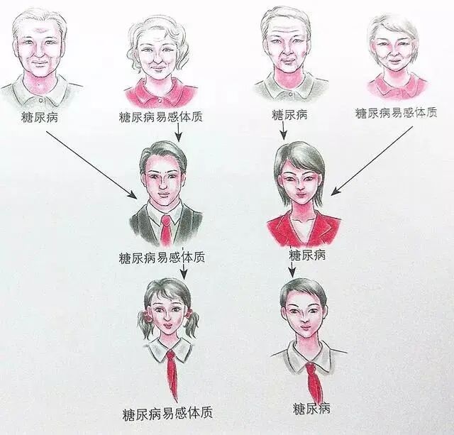 当然,这并不意味着父母有糖尿病,子女就一定会患糖尿病。从现代医学观点来看,部分人可能有某些基因,对糖尿病具有易感性。也就是说,在某种环境中,就有可能发病,而避免这种环境,就可能不发病。目前认为,这种环境与饮食的能量过剩和生活方式改变、活动太少及肥胖有关。
