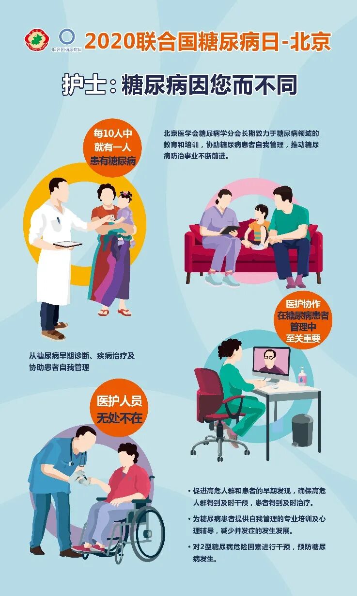 联合国糖尿病日由世界卫生组织和国际糖尿病联盟于1991年共同发起,定于每年的11月14日,其宗旨是引起全球对糖尿病的警觉和醒悟,开展全球范围内的糖尿病宣传教育活动,唤起公众对糖尿病的认知,动员社会上的各方力量防治糖尿病。2020年联合国糖尿病日的主题为“护士与糖尿病”。